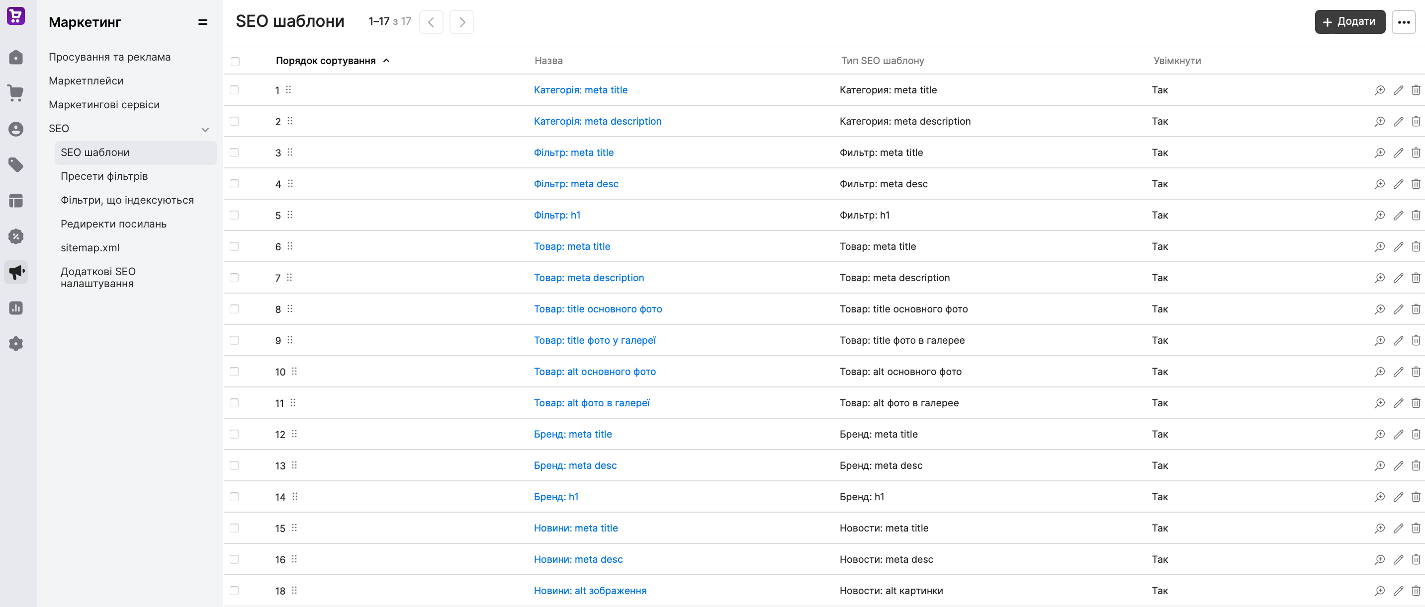 На платформе доступны SEO-шаблоны: вы один раз задаете формулу, и магазин генерирует метатеги для всех страниц выбранного типа — категорий, товаров, брендов и т. д. Есть готовые пресеты, которые можно взять за основу и подкорректировать под свою нишу. При этом для важных страниц, которые должны приносить больше всего трафика, лучше прописать теги вручную — так они будут более точными и привлекательными.
