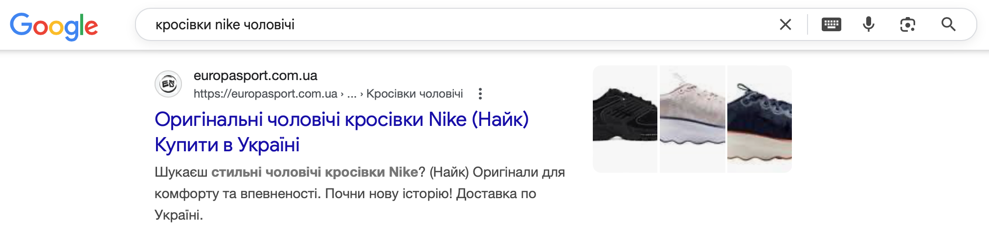 Пример для категории. Title: «Кроссовки мужские — новинки сезона, бесплатная доставка». Description: «Мужские кроссовки для города и спорта. Размеры 40–46, обмен 14 дней, доставка по Украине.»