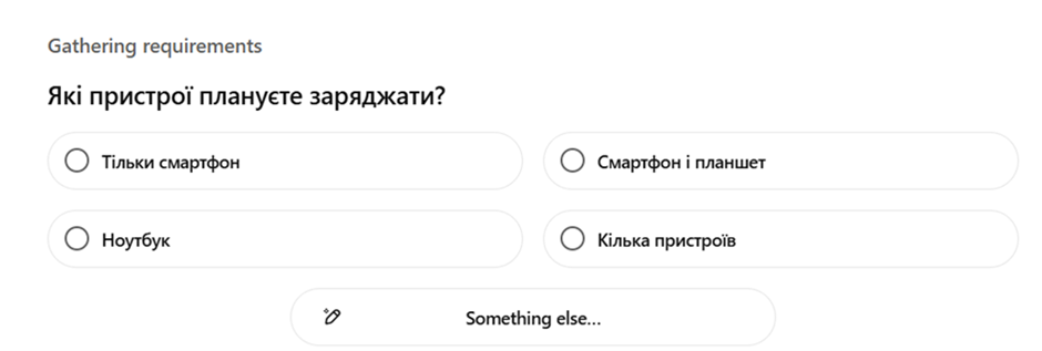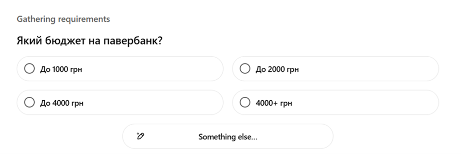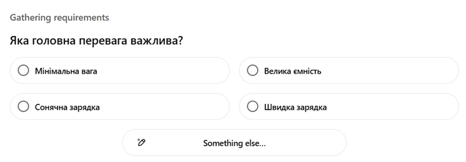 Модель анализирует содержание вопроса, определяет намерение пользователя и суть самого запроса. Например, в блоке «Покупки» от OpenAI система задаёт ряд уточняющих вопросов о том, какой именно продукт интересует человека. Для примера мы использовали запрос «какой повербанк лучше купить для путешествия». ChatGPT Shopping последовательно задал такие вопросы: