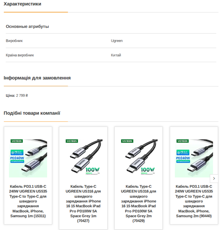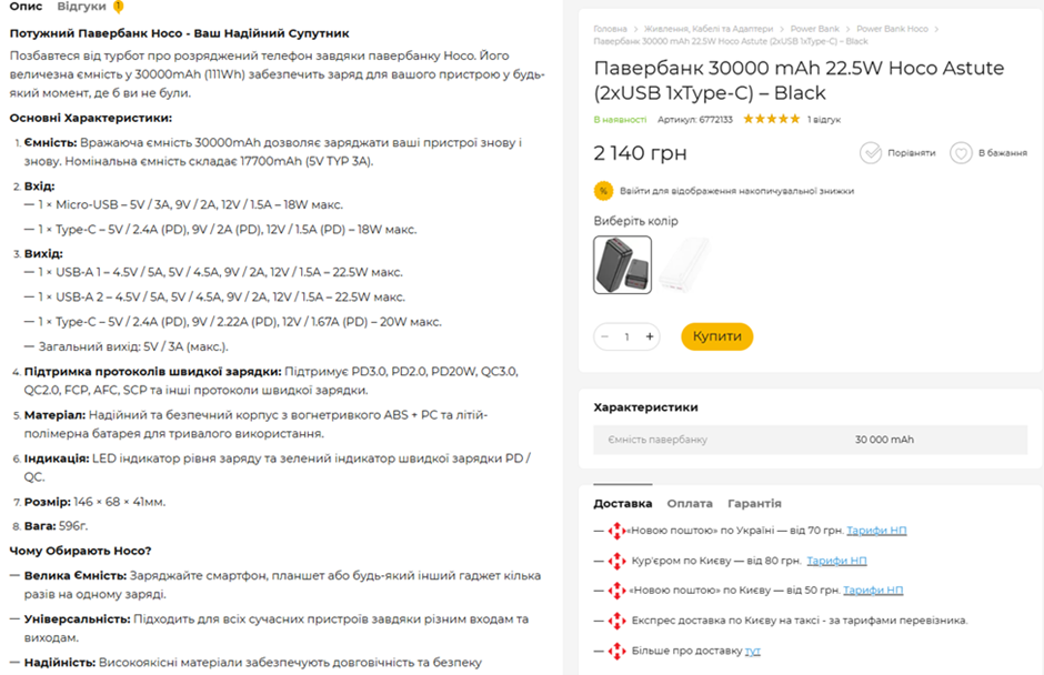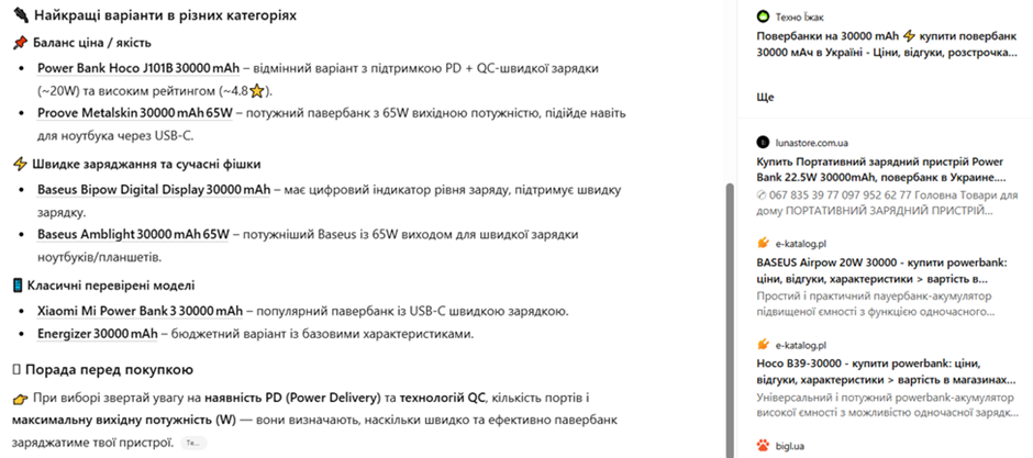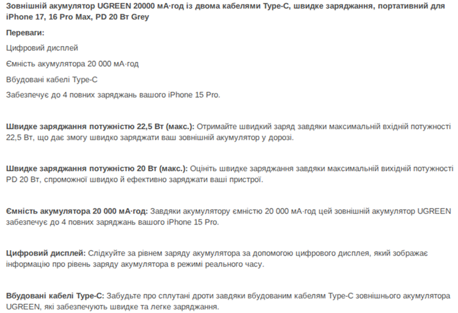 Например, в описании одного из повербанков, который рекомендовал ИИ, есть: структурированная характеристика продукта, таблица, информация о комплектации, производителе, цене и сопутствующих товарах. Каждый из структурных элементов описания чётко отделён с помощью подзаголовков.