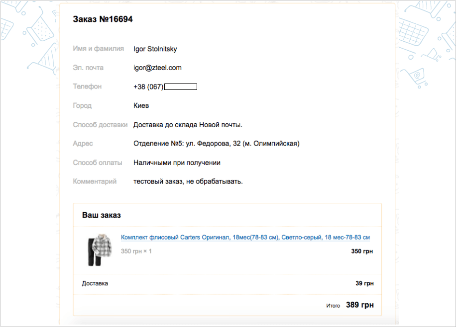 После заполнения формы, пользователь видит всю информацию о заказе: выбранные товары, их стоимость, адрес доставки, тип оплаты, а также номер заказа.