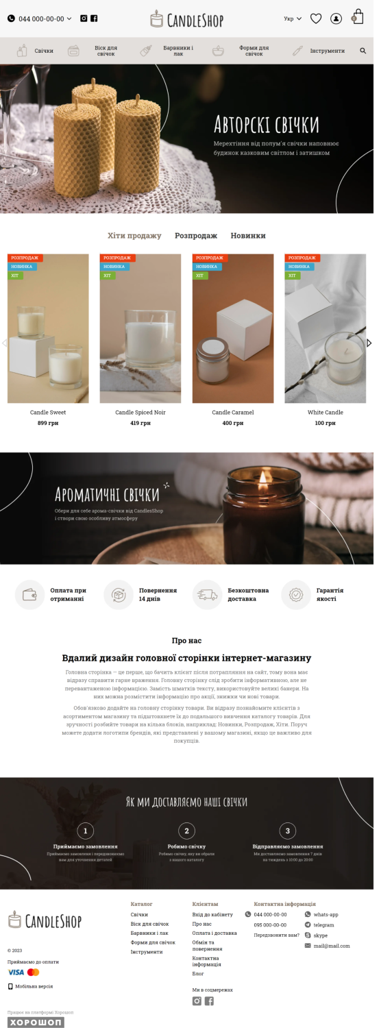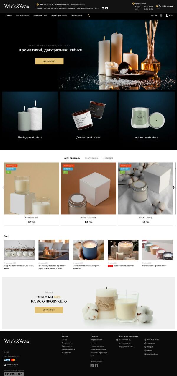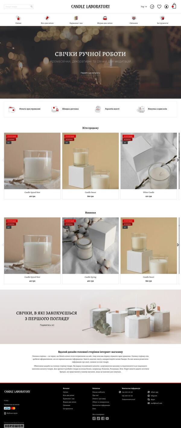 Дизайн интернет-магазина свечей тоже выбирайте в нейтральных, не слишком насыщенных оттенках, чтобы передать пользователям атмосферу тепла, гармонии и спокойствия. Основной акцент делайте на привлекательном визуале. На первом экране может быть размещен большой баннер, а ниже — несколько меньших слайдеров, которые отображают ваш ассортимент.
