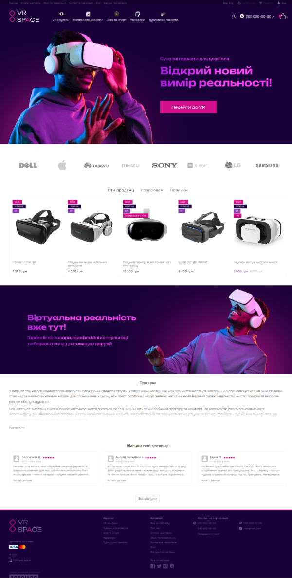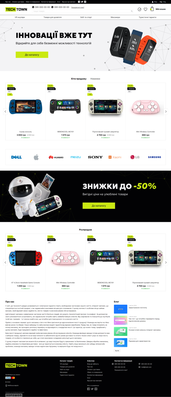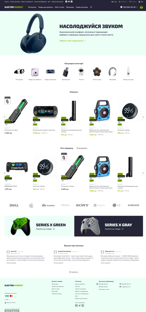 Интернет-магазины электроники и гаджетов могут смело использовать яркие цвета и много баннеров. На главную страницу целесообразно поместить блок со списком брендов, которые у вас представлены, поскольку для многих пользователей компания-производитель нужного электронного девайса имеет приоритетное значение. Карточки лучше делать не очень большими — обычно эта ниша предполагает много товаров в ассортименте, и главное в них характеристики, а не фотографии.