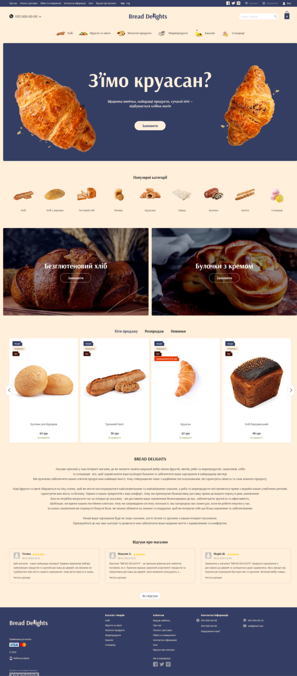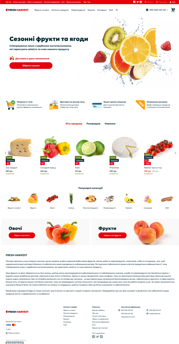 Постоянные акции в интернет-магазинах продуктов — особенность ниши. Используйте на сайте много ярких слайдеров и не ограничивайтесь одной баннерной линией. Как настроить баннеры на главной странице сайта, читайте в нашей статье. Карточки товаров лучше делать компактными, ведь основная задача интернет-магазина еды — показать разнообразие продукции.