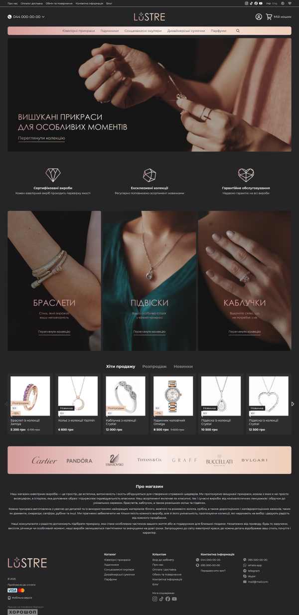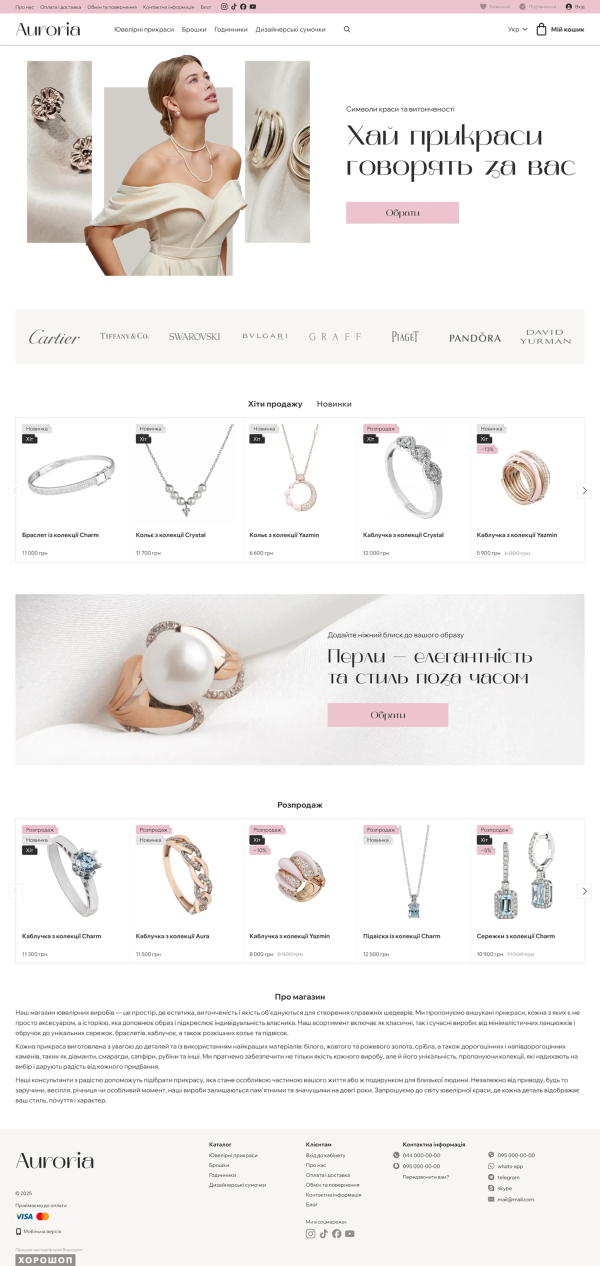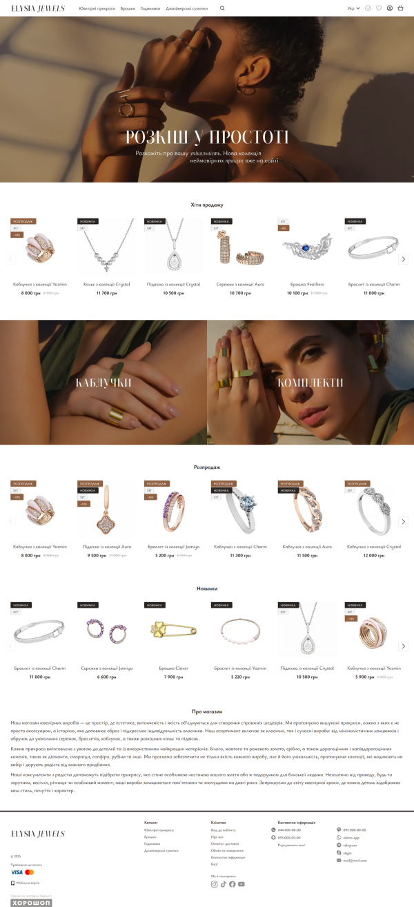 Фотографии украшений часто имеют предсказуемую цветовую гамму в оттенках золота и серебра. Поэтому целесообразно использовать контрастные фоны для фото или добавить в дизайн акцентный оттенок, который будет аккуратно сочетаться с фотографиями товаров. Карточки лучше сделать большими, так они сразу будут привлекать внимание.
