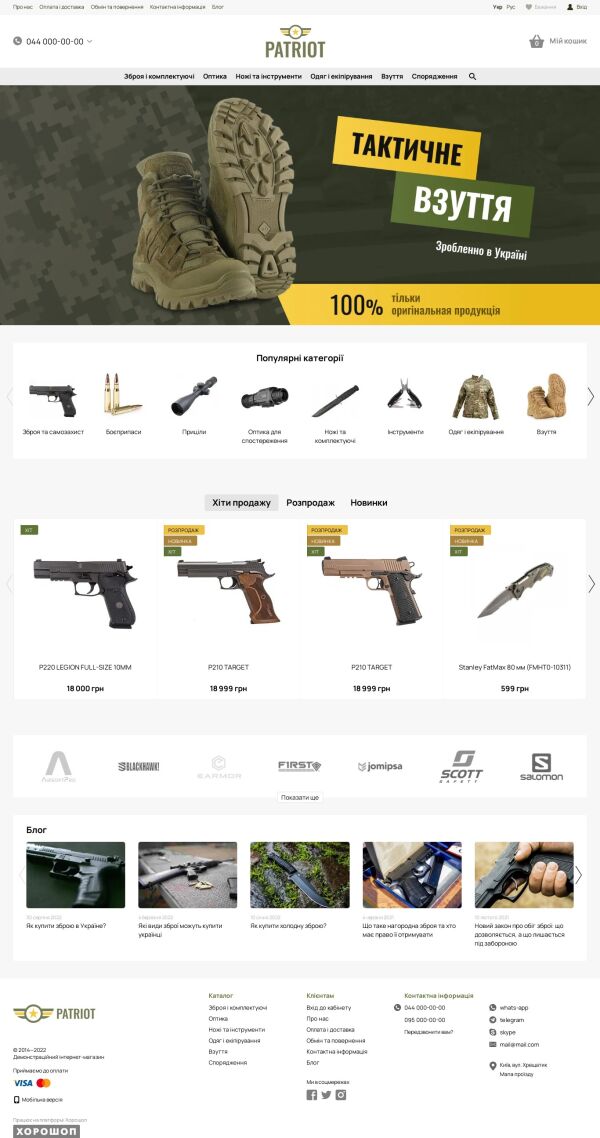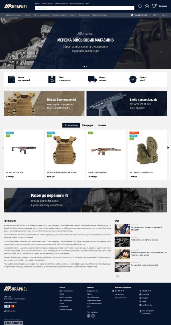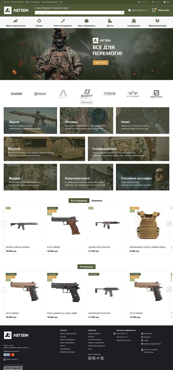 Интернет-магазин военного снаряжения оформляйте в сдержанной цветовой гамме без слишком ярких акцентов. Основное внимание при выборе товаров этой категории уделяется техническим параметрам, поэтому позаботьтесь о полном описании и характеристиках в карточках товара. В превью карточек в каталоге должны сразу отображаться модификации — размерная сетка, цвет, материал и тому подобное. Главную страницу не следует перегружать большим количеством баннерных линий. Лучше добавить блоки с товарами и перечнем брендов, представленных в вашем магазине.