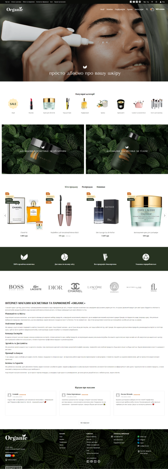 Ниша косметики многогранна, поэтому при выборе макета следует опираться на особенности ваших товаров и портрет покупателя. Например, для интернет-магазина мужской косметики отлично подойдет темный дизайн сайта, с контрастным, но сдержанным интерфейсом. Если в ассортименте органические уходовые средства — выбирайте спокойные цвета, которые ассоциируются с природой. А при продаже товаров, ориентированных преимущественно на молодежь, можно экспериментировать с ярким дизайном.
