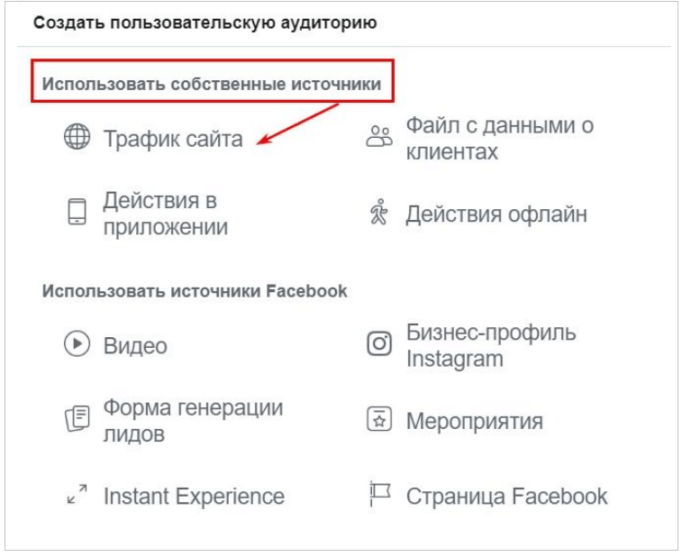 Для створення індивідуалізованих аудиторій відвідувачів сайту, необхідно вибрати мету «Трафік сайту». Збирати людей в окремі аудиторії можна за кількома параметрами.