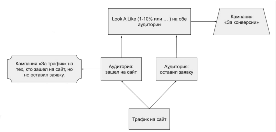 Відправна точка — блок «Трафік на сайт». Будь-який користувач, який переходить на рекламну публікацію, потрапляє на сайт. Є два варіанти: або користувач зайшов на сайт і залишив заявку, або зайшов на сайт і не залишив. Це вже дві потенційні аудиторії. Наприклад, тим, хто зайшов на сайт, але не залишив заявку, повторно можна показати рекламу, створивши кампанію з метою оптимізації «Трафік». Мета «Трафік» у цьому випадку найбільш оптимальна, адже призначена для людей, які з максимальною вірогідністю перейдуть на кінцевий урл.
