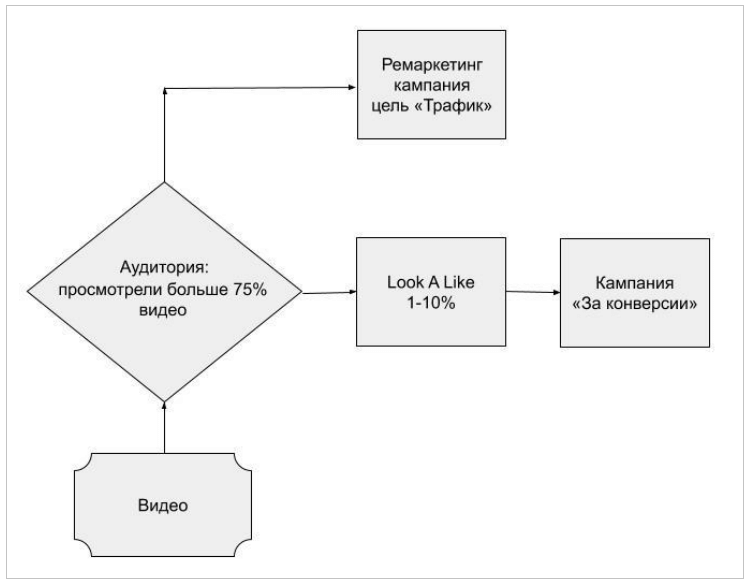 Ця стратегія підходить для бізнесу, який не знає свого клієнта. Щоб дізнатися вашу аудиторію, потрібно показати відео вашого продукту максимальній кількості людей, і сегментувати всіх за максимальною довжиною перегляду відео. Рекомендується робити це за допомогою параметра «Переглянули відео більше, ніж на 75%». При створенні аудиторії, додайте до посилання в значенні відео, які використовувалися у рекламному кабінеті. Інформація про перегляди цих відео збереться в аудиторію. Також можна створити Look A Like-аудиторію людей, які схожі на тих, хто зацікавився відео. Look A Like-аудиторій може бути близько десяти, наприклад, від 1 до 2%, від 2 до 3%, від 6 до 7% і так далі.