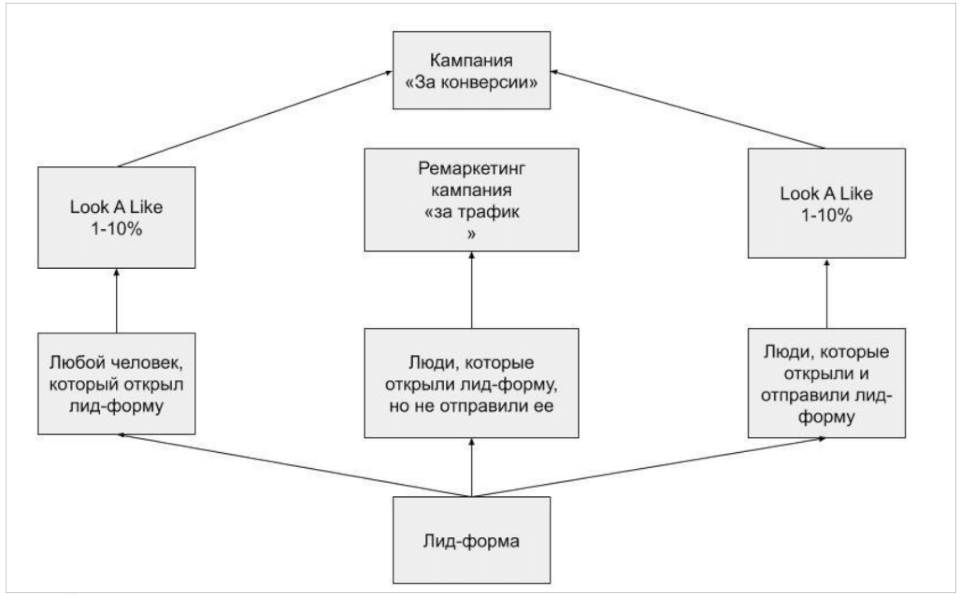 З аудиторій людей, які зайшли на сайт, і людей, які зайшли і залишили заявку, можна створити Look A Like-аудиторії. Наприклад, створити Look A Like-аудиторію в розмірі від 1 до 10% від населення країни, яка вибирається по інтересам і поведінковим паттернам. Facebook буде показувати оголошення людям, які з максимальною ймовірністю здійснять потрібну дію.