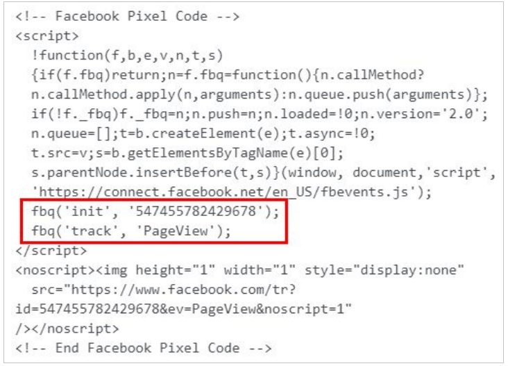 У коді є дві змінні рядки: fbq init — номер вашого пікселю, який необхідний, щоб сегментувати аудиторії або різні сайти, та fbq track — подія, що відстежується. Подія, яку за замовчуванням встановлено в кожен Pixel Facebook, це «Відвідування сторінки», але ви можете замінити його на «Лід», «Покупку», «Пошук», «Перегляд контенту», «Кількість проведеного часу» тощо.